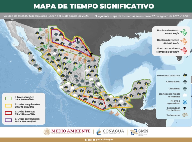 Por otra parte, la onda tropical Núm. 24 se desplazará sobre el sur y occidente del territorio nacional, en combinación con el ingreso de humedad del Océano Pacífico, propiciará lluvias muy fuertes a puntuales intensas acompañadas de descargas eléctricas en ambas regiones, además de chubascos y lluvias fuertes en el centro del país, incluyendo el Valle de México.