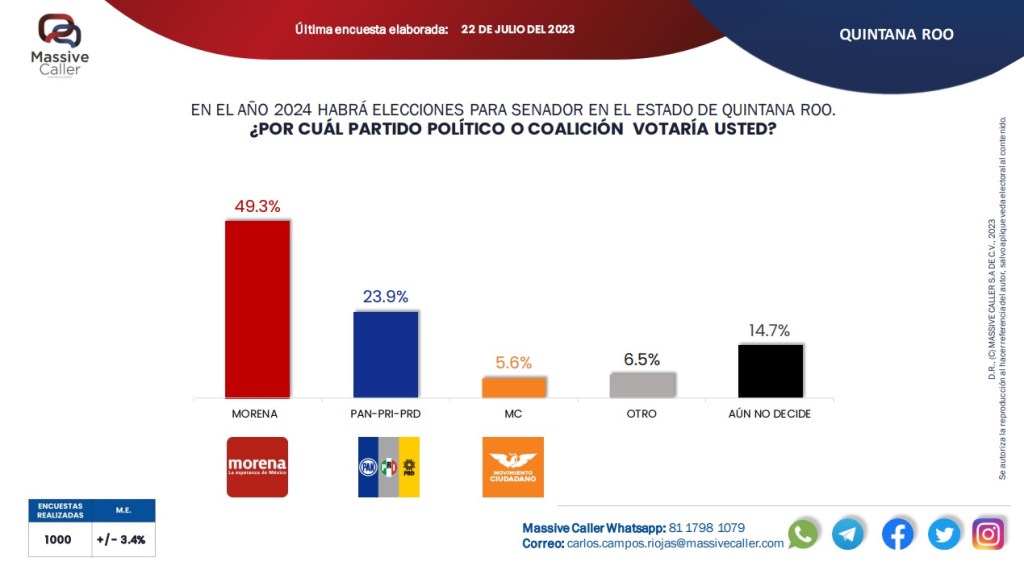 Esta mañana, a través de redes sociales, la empresa encuestadora “Massive Caller” dio a conocer su medición de la intención de voto para senadores de Quintana Roo, en la cual Morena mantiene su ventaja en esta materia, al contar con un 47.8 por ciento, seguido del 25.7 por ciento de la coalición PAN-PRI-PRD.