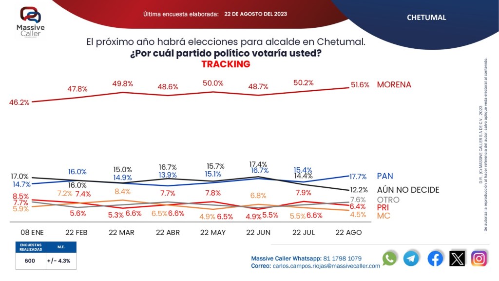 Los resultados de 600 encuestas realizadas en Chetumal, por partido señalan que Morena, en la ‘fotografía’ del momento, tiene un 51.6% de las preferencias; seguido de lejos por el PAN con 17.7%; PRI, 6.4%; Movimiento Ciudadano. 4.5%; otro con 7.6% y un 12.2% que aún no decide.