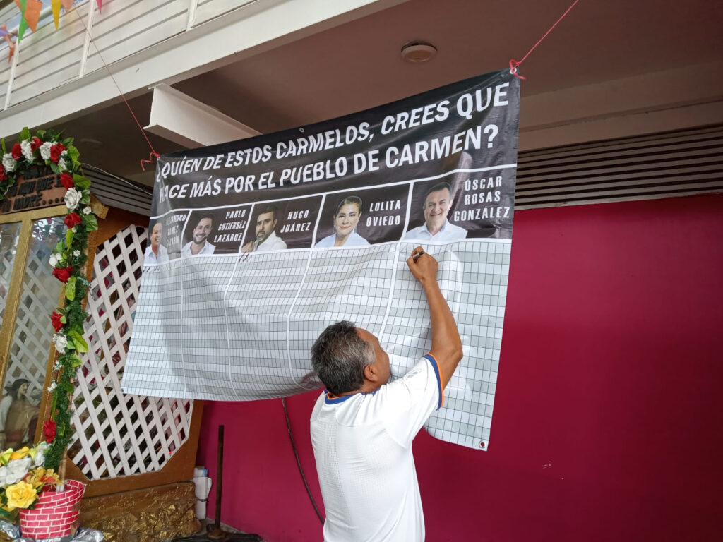A muy temprana hora de ayer una lona fue colocada por trabajadores del Congreso del Estado de Campeche y “fieles” seguidores de Gómez Cazarín en la zona de transición del mercado. En ella se leía: ¿Quién de estos carmelos crees que hace más por el pueblo de Carmen?, y en la parte posterior tenía una tabla con fotografías y nombres de Alejandro Gómez Cazarín, Pablo Gutiérrez Lazarus, Hugo Juárez, Lolita Oviedo y Óscar Rosas González.