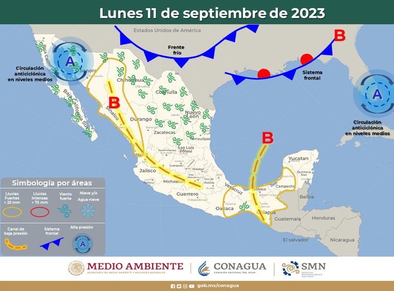 Agrega que también provocarán lluvias con chubascos y lluvias fuertes en el occidente, sur, oriente y sureste del territorio nacional, incluida la Península de Yucatán.