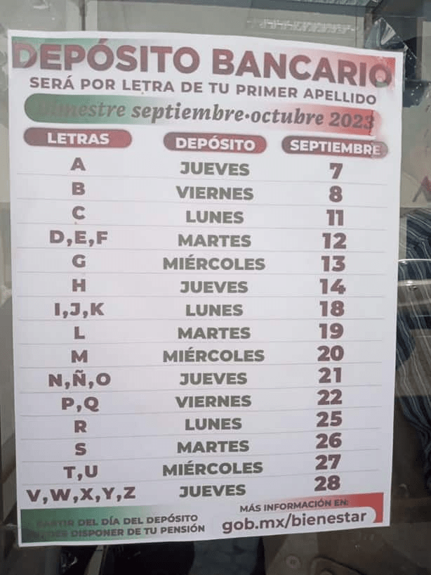 Este martes 12 de septiembre el pago de pensión es para las personas cuyos apellidos inician con las letras D, E y F, mañana corresponde a la letra G, el jueves 14 a la letra H y el 15 no habrá pago por ser día festivo, reanudándose el pago hasta el lunes 18.
