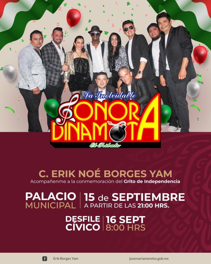 «La Inolvidable Sonora Dinamita, el Tributo» será el primero en tomar el escenario, a las 21 horas, en el Palacio Municipal de José María Morelos, donde gobierna el alcalde Erik Noé Borges Yam.