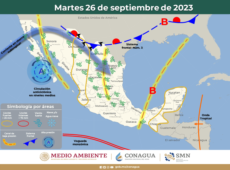 Finalmente, una circulación anticiclónica en niveles medios de la atmósfera mantendrá el ambiente vespertino caluroso a muy caluroso en la mayor parte del territorio nacional, así como escaso potencial de lluvias sobre entidades de la Mesa del Norte y la Mesa Central, así como en el noroeste de México.