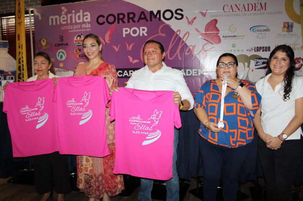 Con la presentación de la playera y medalla conmemorativa de esta carrera, que se realiza en coordinación con el Ayuntamiento de Mérida, que preside el alcalde Renán Barrera Concha, esta mañana con la presencia del Secretario Técnico de Deportes del Ayuntamiento de Mérida, Jesús Aguilar y Aguilar; Naomi Peniche López, Presidenta Nacional de la Cámara Nacional de la Mujer (CANADEM); Rosario Espadas Peniche, Directora General del Comité Estatal; y Fátima Peña Medina, Subdirectora de Planeación y Vinculación del Instituto Tecnológico de Mérida.