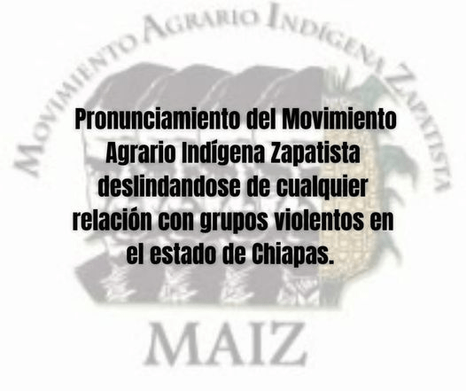En relación con los incidentes de violencia en Chiapas, el Movimiento Agrario Indígena Zapatista enfatizó que han sido confundidos en diversos medios nacionales con organizaciones populares que han servido de bases de apoyo para la operación de ciertos grupos criminales. Afirmaron que se les ha confundido con el grupo delictivo denominado «El Maíz» que opera en la región de Chicomuselo, Frontera Comalapa, entre otros municipios, pero aclararon que son ajenos a este grupo delictivo.