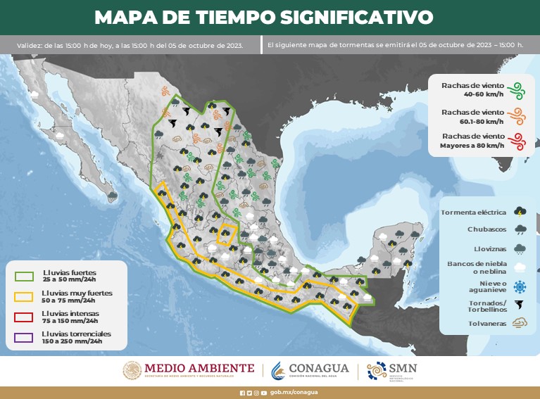 Por otra parte, un canal de baja presión en el sureste del territorio nacional, asociado con una zona de baja presión con probabilidad de desarrollo ciclónico al sur de las costas de Guatemala, Chiapas y Oaxaca, aunado al ingreso de humedad del Océano Pacífico, Golfo de México y Mar Caribe, provocarán lluvias fuertes a muy fuertes con descargas eléctricas en el oriente, sur y sureste de la República Mexicana, así como chubascos en la Península de Yucatán.