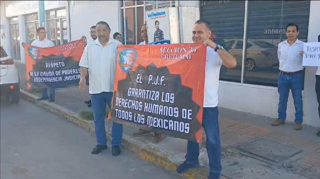 Por otra parte, en el juzgado primero de distrito, con sede en Chetumal, los manifestantes también mostraron lonas con mensajes como «Cese a los ataque», «No más ataques a la división de poderes a la independencia del Poder Judicial».