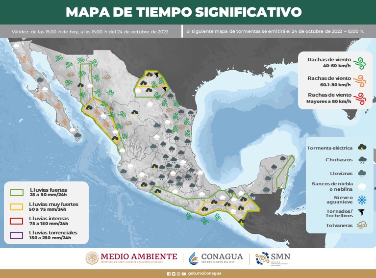 Finalmente, canales de baja presión sobre el interior del país, en combinación con el ingreso de humedad del Océano Pacífico y Golfo de México, ocasionará chubascos con lluvias fuertes en el noreste, centro y oriente del territorio nacional.