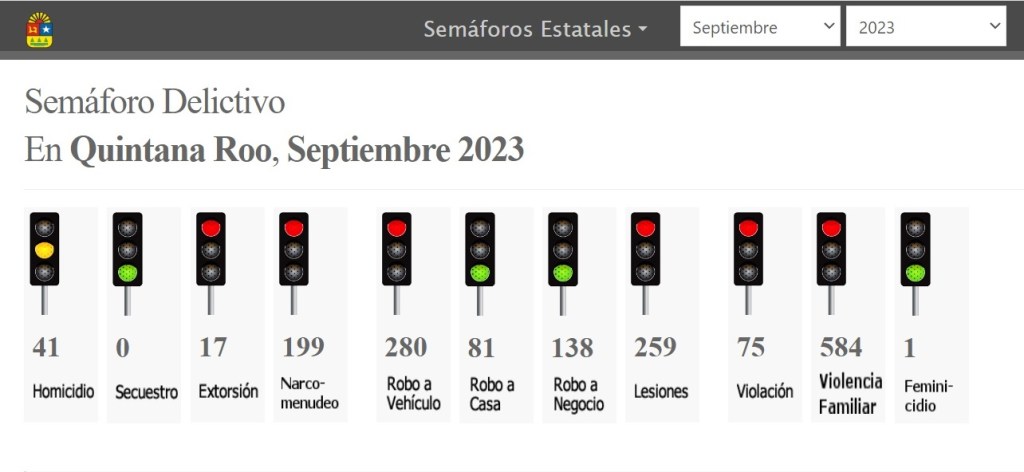 Solo en septiembre, detalla el informe, fueron cometidos 4 mil 508 delitos en Quintana Roo, y el Semáforo Delictivo especifica que los delitos más cometidos son: homicidios, 41; extorsión, 17; narcomenudeo, 199; lesiones, 259; violación, 75; y violencia familiar con 584 casos denunciados.