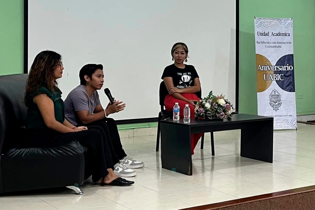 En la plática intervinieron las y los estudiantes Gabriela de Jesús Flores Medina, de la primera generación y quien actualmente se desempeña como profesora del área Responsabilidad Social de la UABIC; Eduardo Rogelio Uc Canché, de la sexta generación y quien se encuentra finalizando sus estudios en la Licenciatura en Historia, así como Ingrid Karely Solís Gutiérrez de la octava generación y que está en la parte final de sus estudios en la Facultad de Derecho.