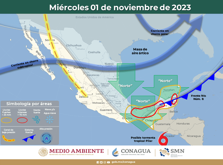El frente frío Núm. 8 se extenderá sobre la Península de Yucatán y el sureste de México, continuará interaccionando con la circulación de la tormenta tropical “Pilar” que se localizará al sur de las costas de Centroamérica (Guatemala y El Salvador), manteniendo el temporal de lluvias intensas a puntuales torrenciales en zonas de Veracruz, Oaxaca, Chiapas, Tabasco, Campeche y Quintana Roo, así como lluvias muy fuertes en Yucatán.