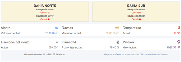 Capitanía del Puerto informó que las bahías norte y sur, seguirán cerradas este 01 de noviembre, por las rachas de 82.80 kilómetros por hora que se han tenido durante la mañana de este miércoles, por lo que prevén que durante el día continúe así.