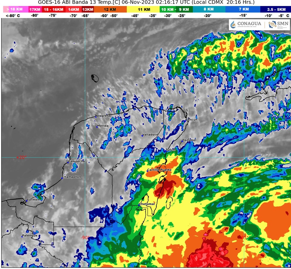 El SMN especifica que por la tarde, persistirán condiciones para lluvias puntuales fuertes en Quintana Roo, así como chubascos en Yucatán y Campeche, las cuales podrían estar acompañadas de descargas eléctricas y generar encharcamientos e inundaciones. Ambiente templado durante la mañana y cálido a caluroso por la tarde. Viento de componente norte con rachas de hasta 45 km/h.