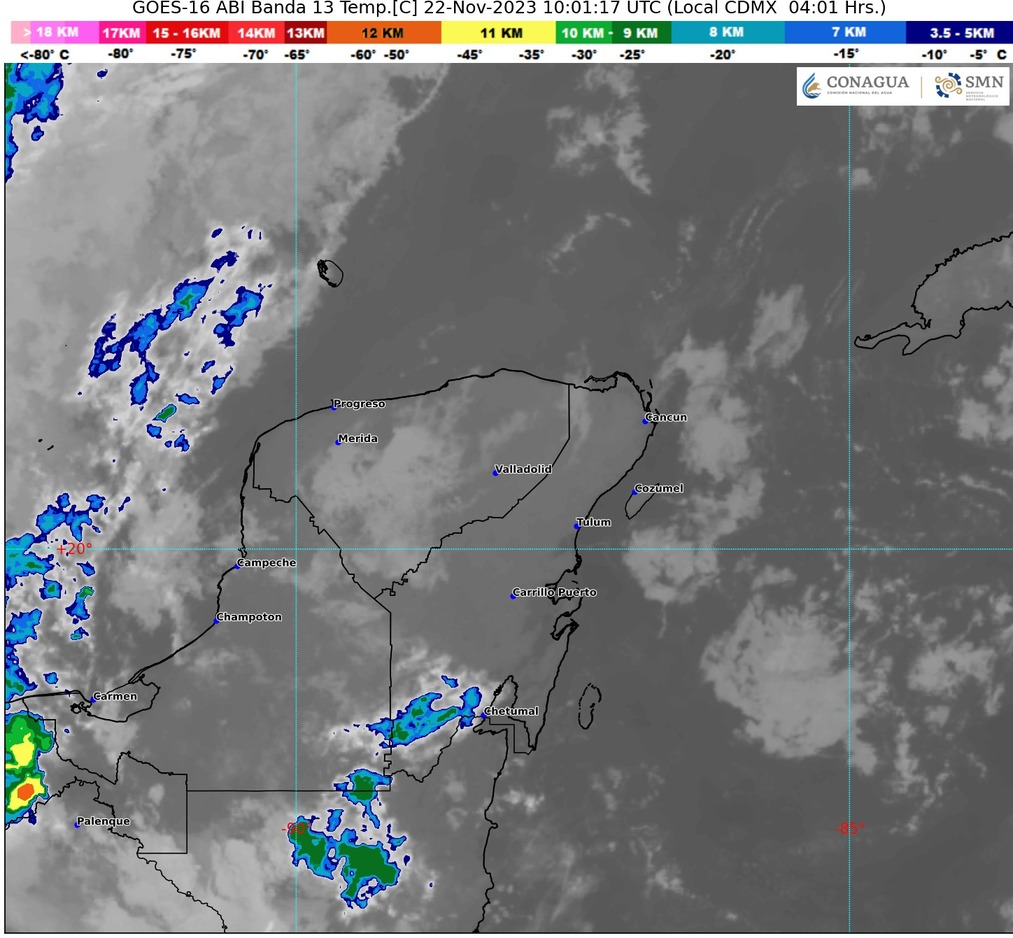 Para la Península de Yucatán el SMN avisa de cielo medio nublado a nublado con lluvias puntuales muy fuertes en Campeche, además de intervalos de chubascos en Yucatán y Quintana Roo; por la mañana, ambiente fresco y durante la tarde cálido a caluroso; viento de dirección variable de 10 a 20 km/h con rachas de hasta 40 km/h en costas de Campeche y Yucatán.