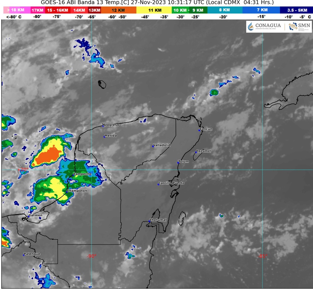 Para la Península de Yucatán habrá cielo medio nublado a nublado con lluvias muy fuertes en Campeche y Yucatán, así como fuertes en Quintana Roo; mismas que podrían incrementar los niveles de ríos y arroyos, ocasionar deslaves, inundaciones y encharcamientos