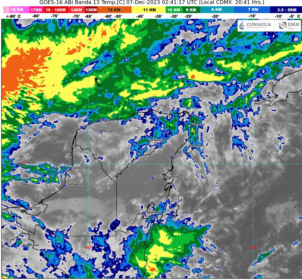 Para la Península de Yucatán habrá cielo parcialmente nublado a medio nublado en el transcurso del día, con probabilidad de lluvias aisladas en Quintana Roo, sin lluvia en Campeche y Yucatán; ambiente templado al amanecer con posibles bancos de niebla, siendo de cálido a caluroso por la tarde; viento de componente norte de 10 a 25 km/h con rachas de hasta 45 km/h.