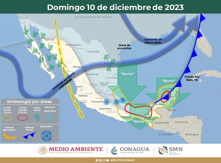 La masa de aire ártico asociada al frente, originará evento de “Norte” muy fuerte a intenso en el litoral del Golfo de México, la Península de Yucatán e Istmo y Golfo de Tehuantepec. Asimismo, se prevé un marcado descenso de las temperaturas en gran parte del territorio nacional.