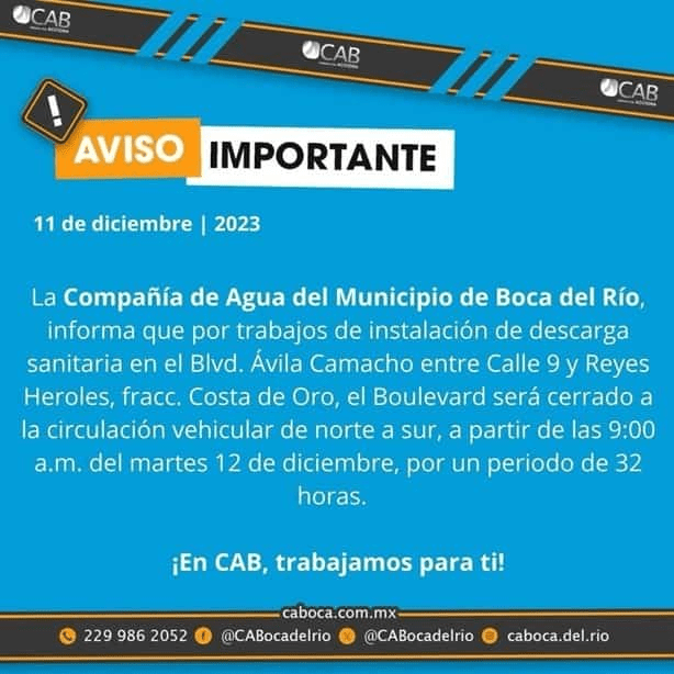 Debido a trabajos de instalación de descarga sanitaria, el bulevar Manuel Ávila Camacho, del municipio de Boca del Río, permanecerá cerrado este martes 12 de diciembre.