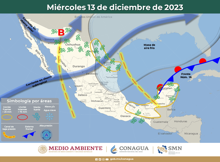 El frente Núm. 16 se mantendrá estacionado sobre el Mar Caribe, continuará interactuando con un canal de baja presión extendido sobre el Golfo de México y sureste del país, ocasionando chubascos y lluvias puntuales fuertes en el noreste, oriente, sureste y Península de Yucatán, con lluvias puntuales muy fuertes en Yucatán y Quintana Roo.