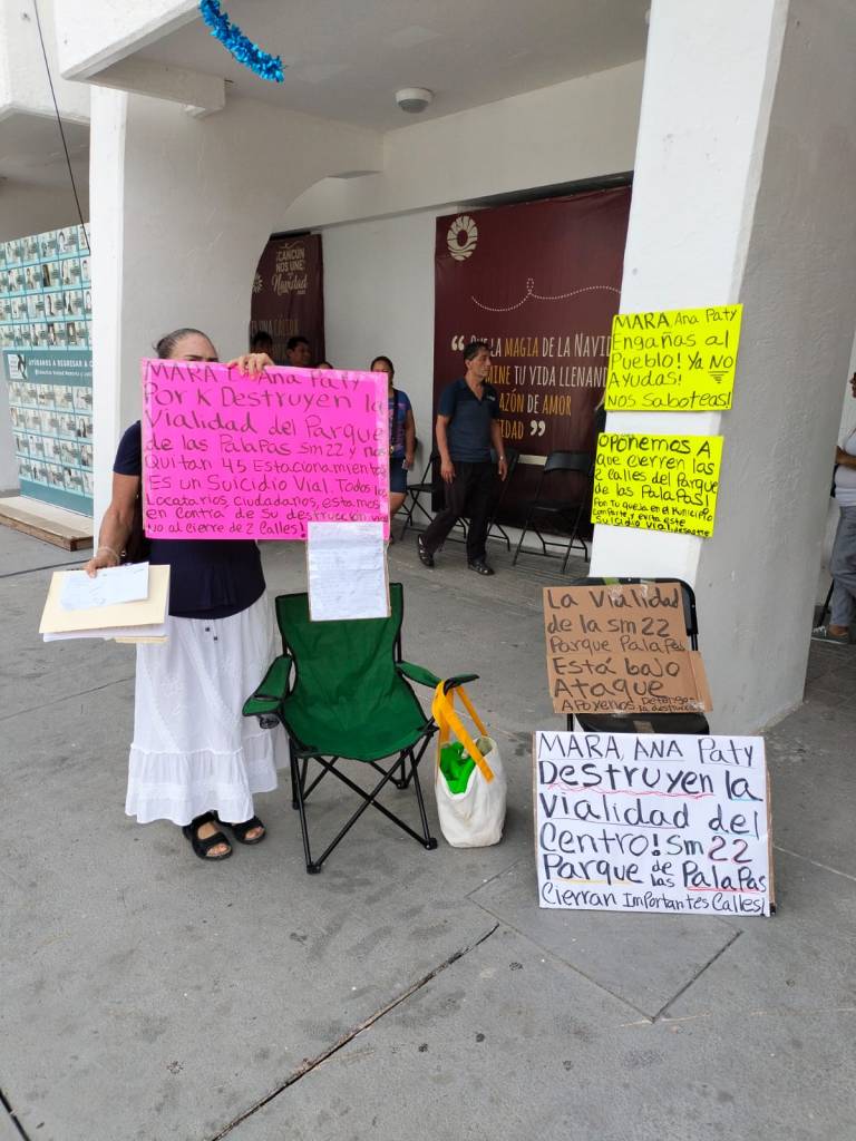 Al grito de “No al cierre de las calles”, los vecinos colocaron pancartas en la explanada y muros del Palacio Municipal donde se leía “Nos oponemos a que cierren las calles del parque de Las Palapas” y “Mara, Ana Paty, destruyen la vialidad de la SM 22”, entre otras cosas