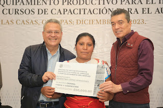 A la par, se entregaron 43 apoyos en equipamiento productivo para el autoempleo con una inversión de más de 1.6 millones de pesos, en beneficio de 69 personas de Chanal, Chamula, Santiago El Pinar, Zinacantán y San Cristóbal, en los siguientes rubros: preparación de alimentos, panadería, repostería, costura y confección, manicura y pedicura, electricidad, estilismo, así como tostado, molido y envasado de café.