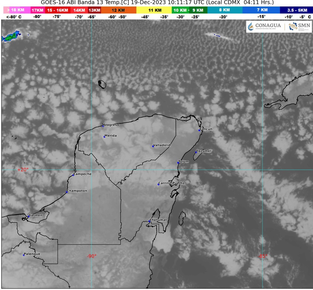 Precisamente, en la Península de Yucatán habrá cielo medio nublado durante el día, con lluvias aisladas en Campeche y Quintana Roo, y sin lluvia en Yucatán; ambiente fresco a templado durante la mañana y templado a cálido por la tarde; viento de componente norte con rachas de 40 a 60 km/h y oleaje de 1 a 3 metros de altura en las costas de Yucatán y Quintana Roo.