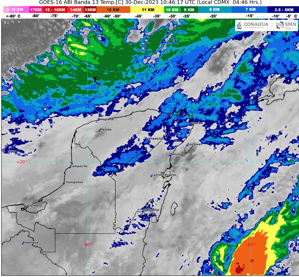 Para la Península de Yucatán habrá cielo medio nublado a nublado durante el día, pronosticándose chubascos en Campeche y Quintana Roo, así como lluvias aisladas en Yucatán, acompañadas de posibles descargas eléctricas.