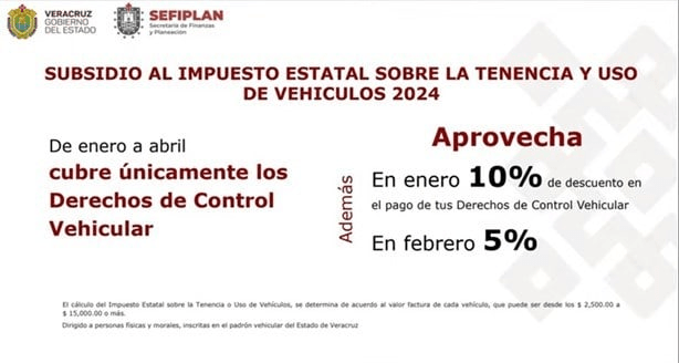 Cabe mencionar que como primer apoyo a los conductores, autoridades del gobierno de Veracruz mencionaron que el pago del derecho de control vehicular sería del 10 por ciento durante el mes de enero.