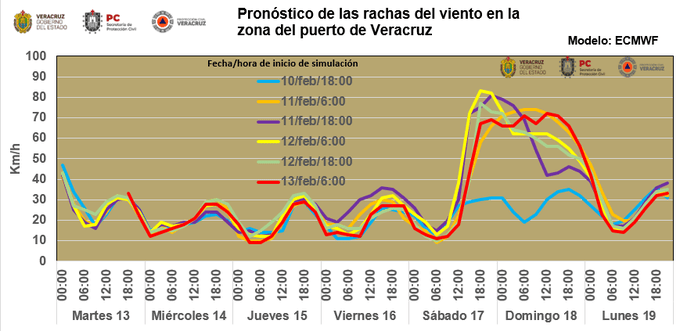 Señalaron que el ingreso del norte intenso para Veracruz será a partir del sábado al mediodía, el cual iniciará con rachas de 40 a 50 kilómetros por hora, siendo para el día domingo las rachas más fuertes, esto entre 70 a 75 kilómetros por hora, durante las primeras horas.