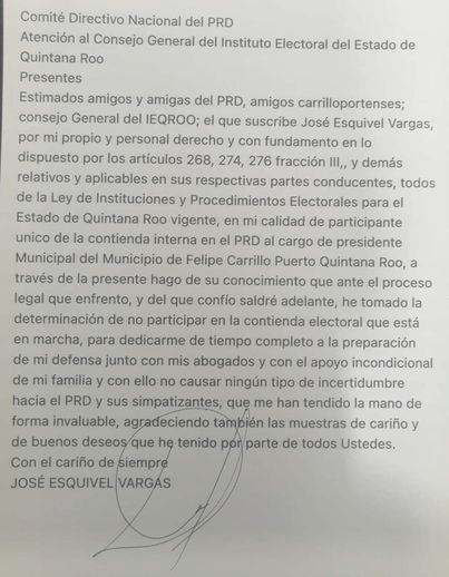 Aunque el exalcalde carrilloportense anunció su retiro de la contienda electoral en Quintana Roo ayer 19 de febrero, su defensa insiste en que sus aspiraciones políticas como candidato del PRD por el cargo que una vez ostentó, antecediendo a Mary Hernández, actual presidenta municipal, permanecen intactas, asegurando que sus derechos político-electorales están garantizados.