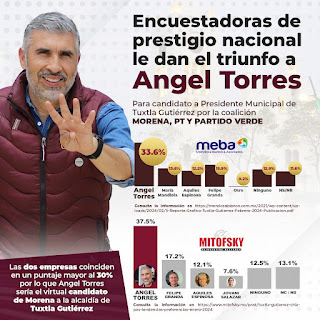 Con más del 30 % de aceptación sus encuestas, Mendoza Blanco & Asociados y Consulta Mitofsky confirman a Ángel Torres en primer lugar en la preferencia de las y los tuxtlecos para ser el candidato de Morena a la presidencia municipal de Tuxtla Gutiérrez.