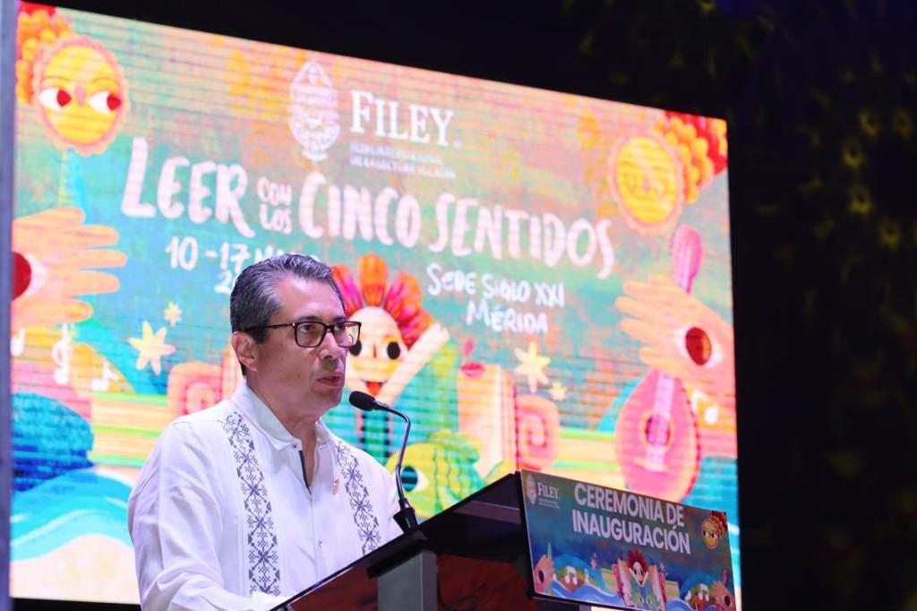 Esta mañana se llevó a cabo la inauguración de la XII Edición de la Feria Internacional de la Lectura Yucatán (FILEY) “Leer con los cinco sentidos”, con la entrega del Premio Excelencia en las Letras José Emilio Pacheco 2024 al escritor David Toscana, cuya semblanza de parte de su vida fue presentada por el reconocido autor Juan Villoro.