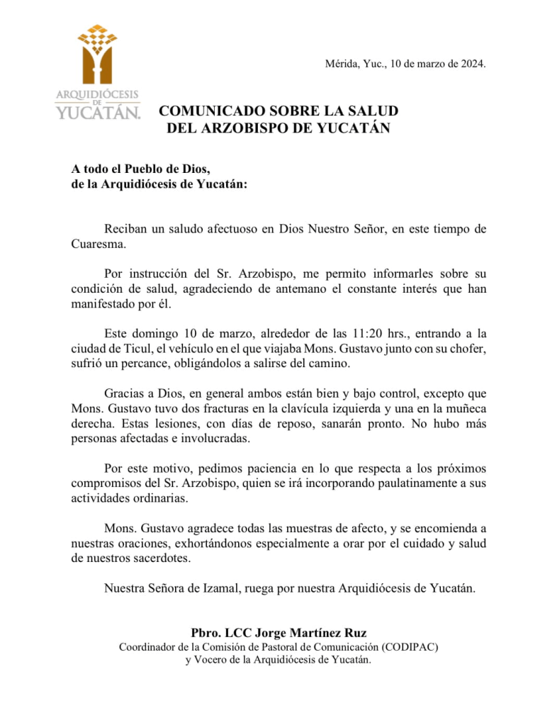 La mañana de este domingo, alrededor de las 11:20 hrs., el Arzobispo Mons. Gustavo Rodríguez Vega, sufrió doble fractura, en un accidente automovilístico en el que viajaba a acompañado de su chofer, a la altura de la entrada a la ciudad de Ticul.
