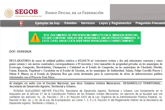 “Se declara de utilidad pública el desarrollo del Proyecto Tren Maya, en los municipios de Escárcega, Campeche, Hecelchakán, Champotón y Calakmul en el estado de Campeche, en los municipios de Chocholá, Mérida, Umán, Kanasín, Tixpéhual y Cacalchén en el estado de Yucatán, en los municipios de Solidaridad, Tulum, Felipe Carrillo Puerto y Othón P. Blanco en el estado de Quintana Roo, que se materializará en la construcción de obras de infraestructura pública sobre los inmuebles”, se lee en el decreto expropiatorio publicado ayer.