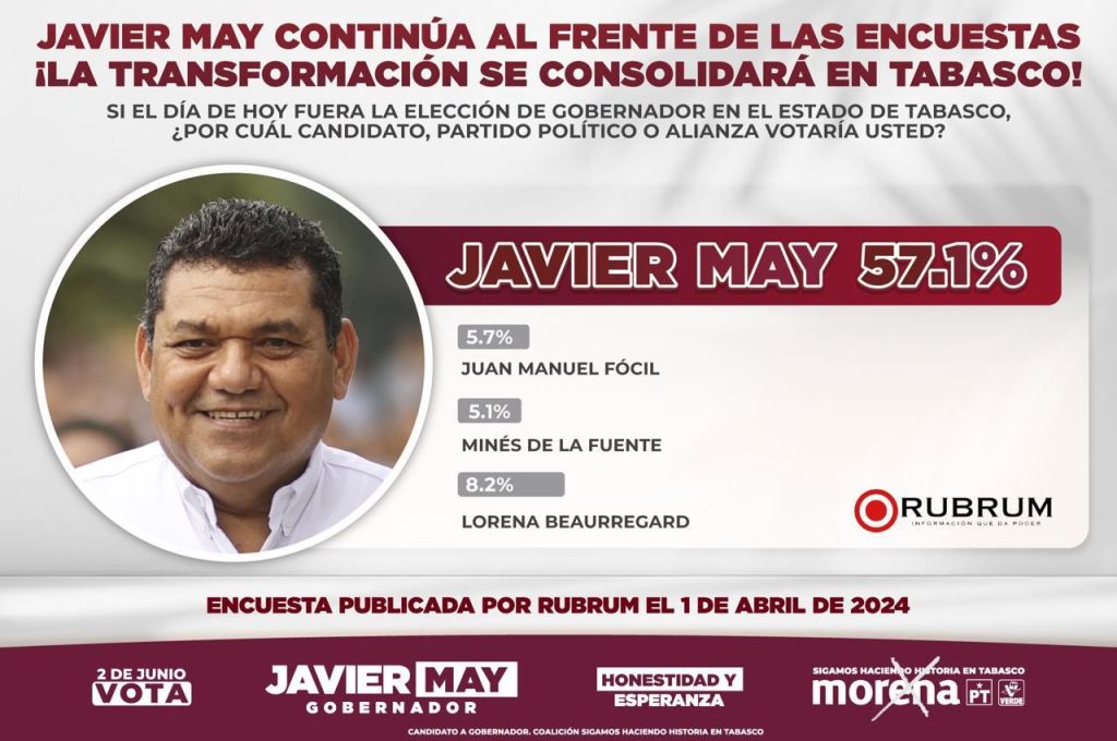 Vale la pena señalar , que ésta empresa no necesita que nadie la califique, pues su trabajo es profesional; una muestra de ello, es que hace apenas unos días el equipo de Campaña del candidato de #morena al gobierno, Javier May Rodríguez, presumió y difundió un sondeo de esta empresa del mes de abril, en dónde se ubica a este candidato con un 57.1% de intención del voto, muy por encima de sus más cercanos adversarios.