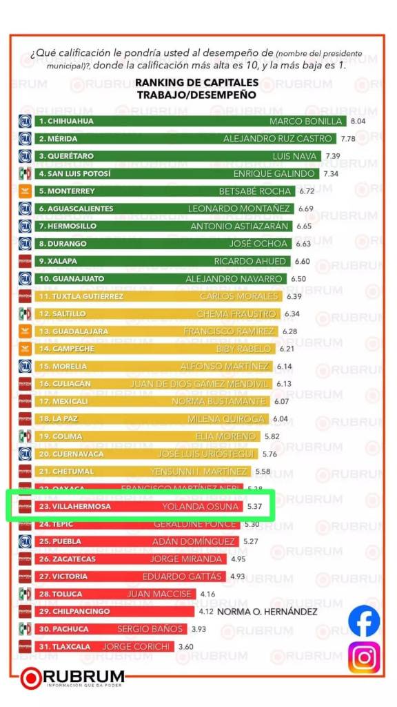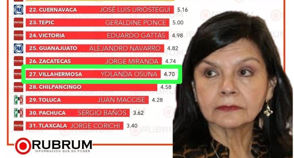 De 31 posiciones, cuando preguntaron a habitantes de Centro, en Tabasco, sobre el «Desempeño y Trabajo», calificaron a Yolanda Osuna Huerta con un vergonzante 5. 37%; lo que la ubicó en el penoso lugar número 23 del casillero de los reprobados.