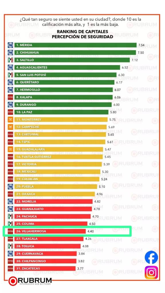 Finalmente en el rubro de Seguridad, también obtuvo la peor calificación; si bien es cierto es de las pocas ciudades capitales que no cuenta con Policía propia, no menos cierto resulta que es tibia, timorata para exigir al Gobierno del Estado se garantice la seguridad pública para sus habitantes. Es muy cortesana con los gobernadores en turno; precisamente por esa razón la población le dió calificación reprobatoria de 4.40% en cuanto a «Percepción de Seguridad»; lo que la ubicó en el casillero número 26, tan solo a 5 lugares de ser la más inepta de las ineptas.