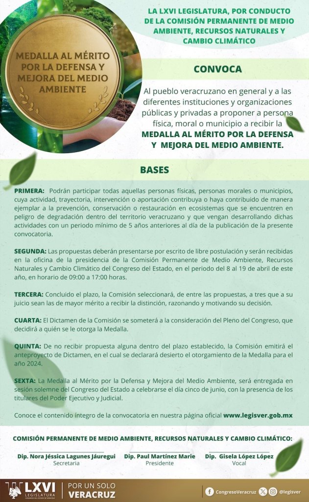 La 66 Legislatura del estado, por conducto de la Comisión Permanente de Medio Ambiente, Recursos Naturales y Cambio Climático, convoca a la población en general, instituciones y organizaciones públicas o privadas a proponer a toda persona física, moral o municipio que cuente con las cualidades suficientes para recibir la Medalla al Mérito por la Defensa y Mejora del Medio Ambiente de este 2024.