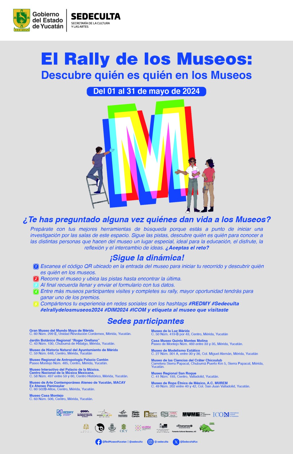 Finalmente, durante todo el mes de mayo, se llevará a cabo por tercer año consecutivo El Rally de los Museos, con el tema “Descubre quién es quién en los museos”, donde el público podrá visitar los espacios participantes de la Red de Museos de Yucatán (REDMY), y al escanear un código QR en la entrada del recinto, le permitirá acceder a la plataforma digital donde encontrará los desafíos que deberá ir completando para finalizar la dinámica.