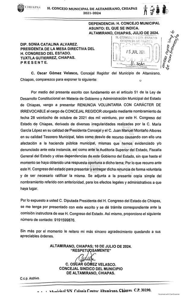 Debido a irregularidades en la entrega de cuentas públicas, dos regidores y el síndico Gabriel Montolla Oseguera renunciaron al Concejo Municipal de Altamirano.