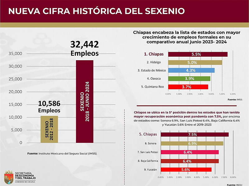 Aunado esto, el Instituto Nacional de Estadística y Geografía (Inegi) dio a conocer que entre 2019 y 2023, Chiapas logró ubicarse en la quinta posición dentro los estados que han tenido mayor recuperación económica post pandemia con 7.5 por ciento, por encima de estados como: Sonora con 6.9, San Luis Potosí con 6.4, Baja California con 6.4 y Yucatán con 5.6.
