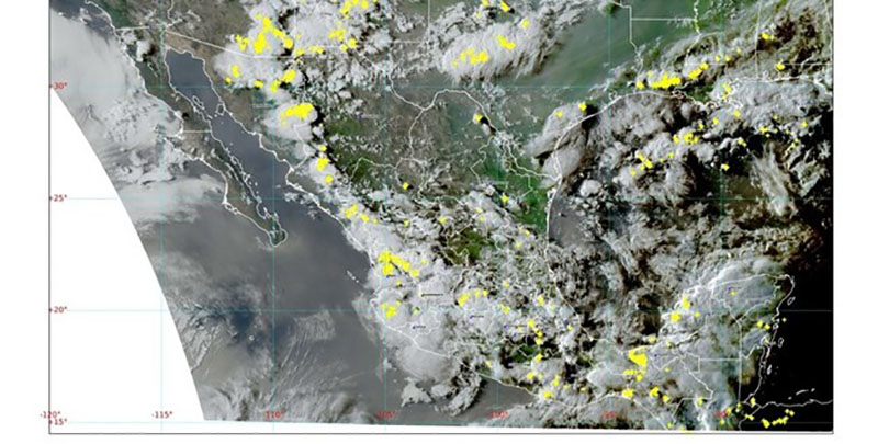 A su vez, un canal de baja presión extendido sobre el interior del territorio nacional, en combinación con divergencia en altura y el ingreso de humedad del océano Pacífico y golfo de México, producirán lluvias fuertes a muy fuertes, descargas eléctricas y posibles granizadas en el norte, noreste, oriente, centro, occidente y sur de México.
