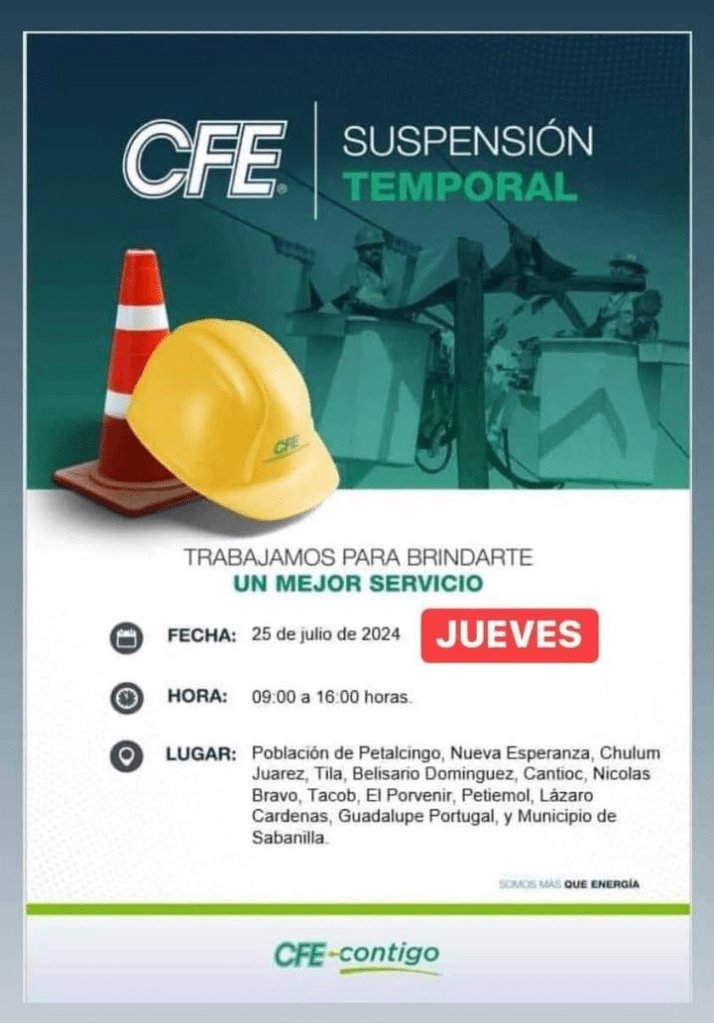 La Comisión Federal de Electricidad (CFE) informa que, debido a trabajos de mantenimiento programados, se suspenderá temporalmente el suministro de energía eléctrica el próximo jueves 25 de julio de 2024. La interrupción se llevará a cabo entre las 09:00 y las 16:00 horas en los siguientes municipios y localidades: