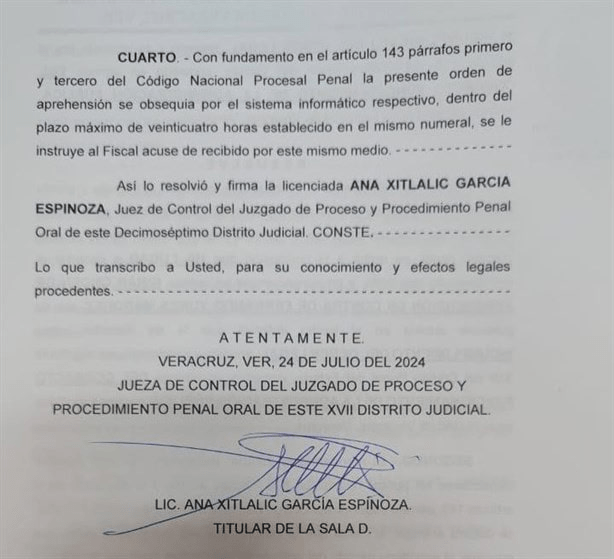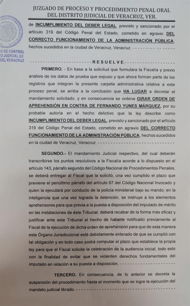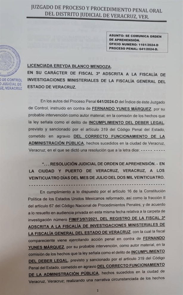 La madrugada de este 25 de julio de 2024, la Juez de Control del Juzgado del Proceso y Procedimiento Penal del XVII Distrito Judicial, Titular de la Sala D, Licenciada Ana Xitlalic García Espinosa, emitió una nueva orden de aprehensión contra el diputado local electo por la vía plurinominal, Fernando Yunes Márquez. La información fue confirmada este jueves y con esta suman dos órdenes que se liberan contra Fernando Yunes.