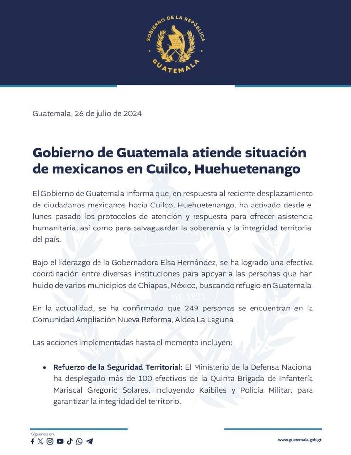 Aunque la situación es crítica con la ayuda humanitaria el Gobierno de Guatemala informa que, en repuesta al reciente desplazamiento de ciudadanos mexicanos hacia Cuilco, Huehuetenango, Guatemala ha activado desde el pasado lunes los protocolos de atención y respuesta para ofrecer asistencia humanitaria a los desplazados de Chiapas.