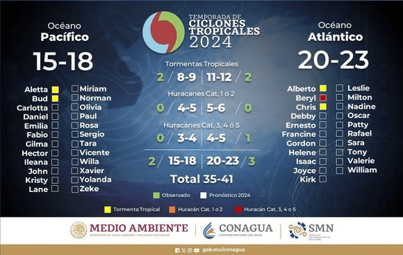 El SMN estima un incremento del 50% en el desarrollo ciclónico en el océano Atlántico, con una proyección de entre 20 y 23 sistemas, incluidos entre 11 y 12 tormentas tropicales y de cinco a seis huracanes de categorías uno o dos, y entre cuatro y cinco huracanes de categorías tres, cuatro o cinco.