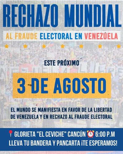 Venezolanos residentes en Cancún han organizado una manifestación en la Glorieta El Ceviche para expresar su rechazo al reciente fraude electoral en Venezuela. La convocatoria es para este 3 de agosto a las 6:00 P.M., y se invita a todos los participantes a llevar banderas y pancartas en apoyo a la causa.