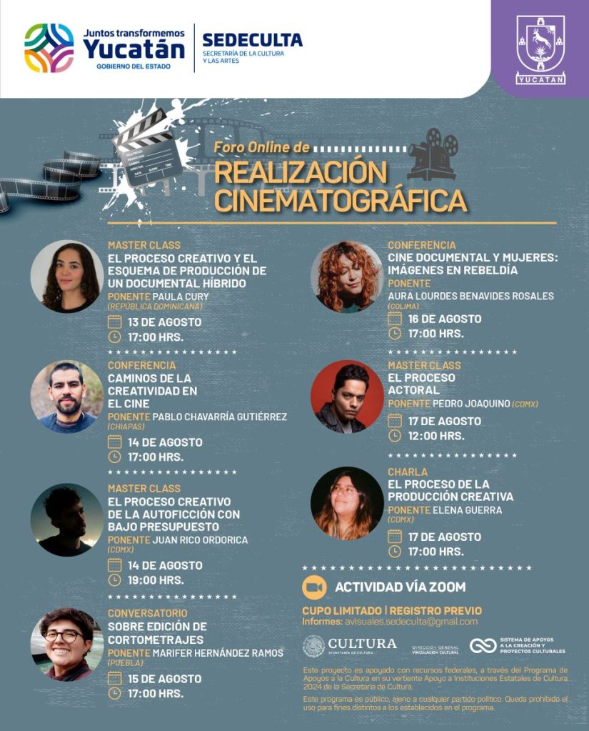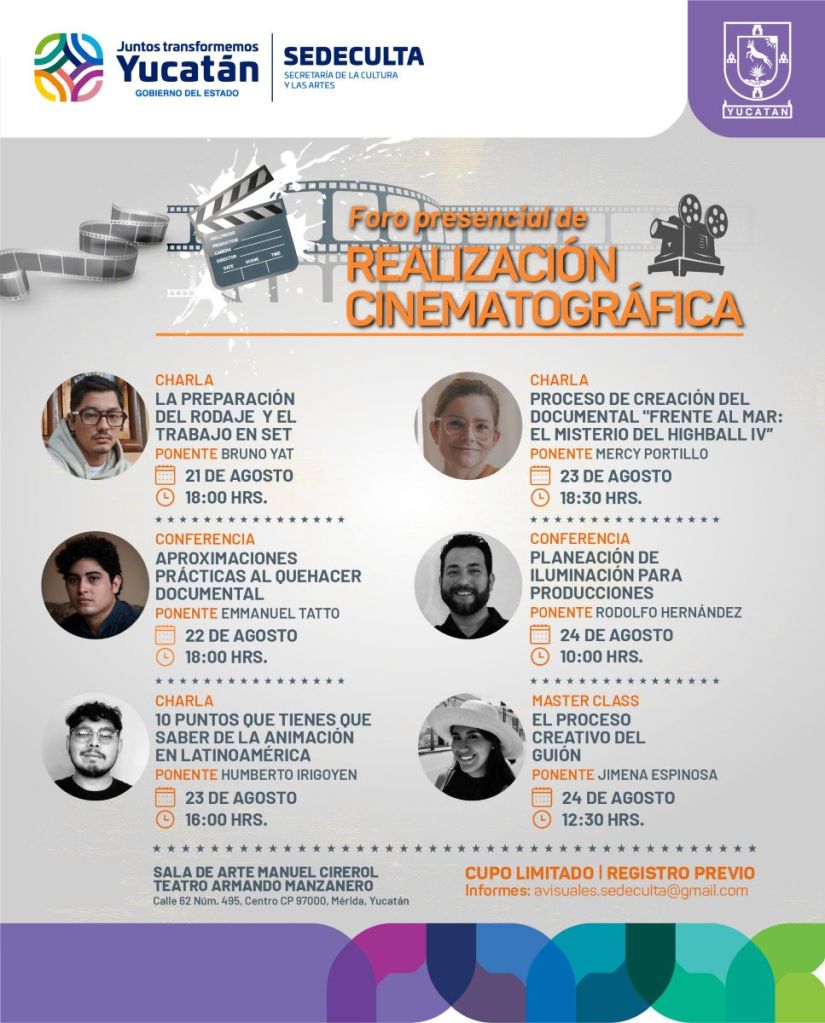Ponentes de Chiapas, Ciudad de México, Colima, Puebla, Yucatán y de República Dominicana encabezarán clases magistrales, charlas y conversatorios del Foro de Realización Cinematográfica, que tendrá efecto del 13 al 24 de agosto en dos modalidades, presencial en la Sala de Arte “Manuel Cirerol” del teatro “Armando Manzanero” y online por Zoom.