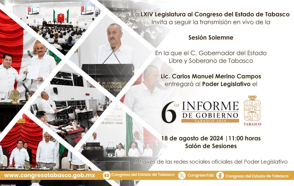 Convoca Congreso de Tabasco a Segundo Período Extraordinario de Sesiones para recibir Sexto Informe de Gobierno del Poder Ejecutivo del Estado